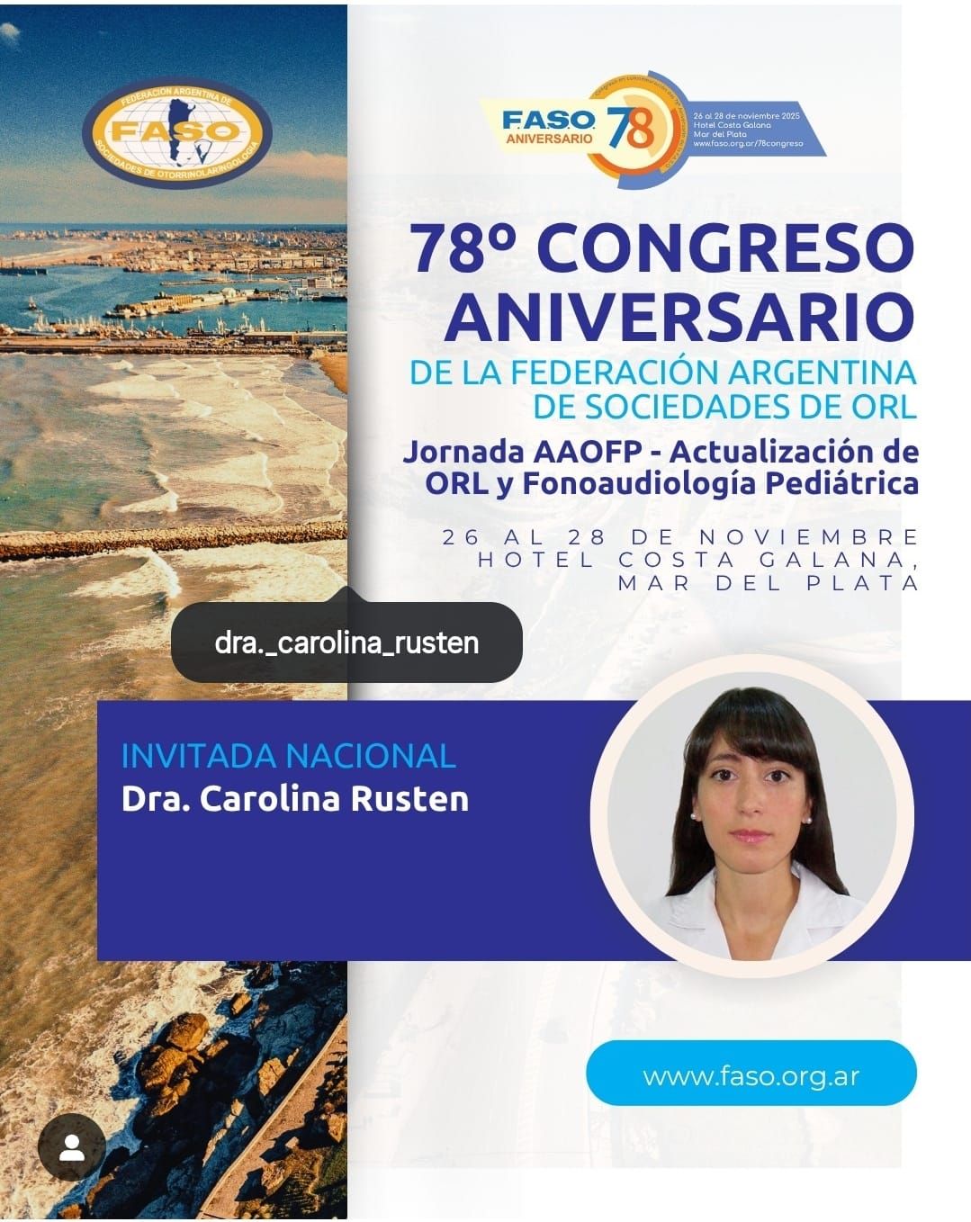- Expositora en Bloque Update – Otología. “Evaluación imagenológica de la otitis media crónica colesteatomatosa” 2° Congreso Online de Otorrinolaringología FASO (Noviembre 2020)