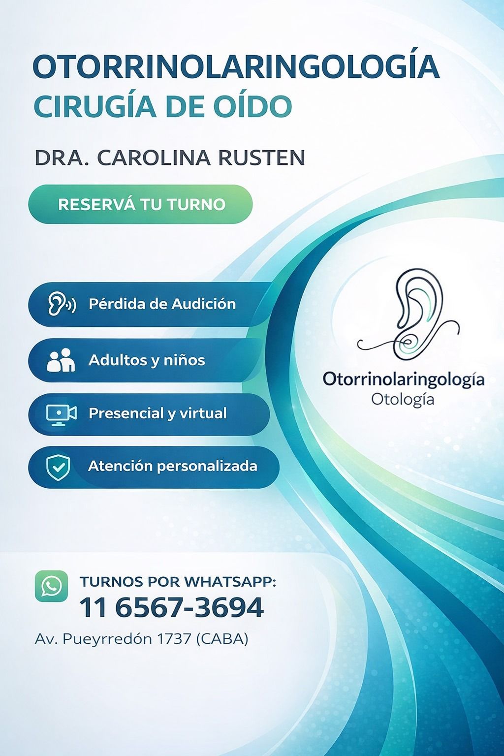 Soy Carolina Rusten, médica egresada en la Universidad de Buenos Aires. Completé la residencia de Otorrinolaringología y la jefatura de residentes en el Hospital Durand. Luego realicé el Fellowship en Otología en el Hospital de Clínicas "José de San Martín". Durante el 2024 fui instructora de residentes de otorrinolaringología en el Hospital General de Agudos “Dr. Teodoro Álvarez”, donde actualmente me desempeño como médica de planta en el área de Otología.
